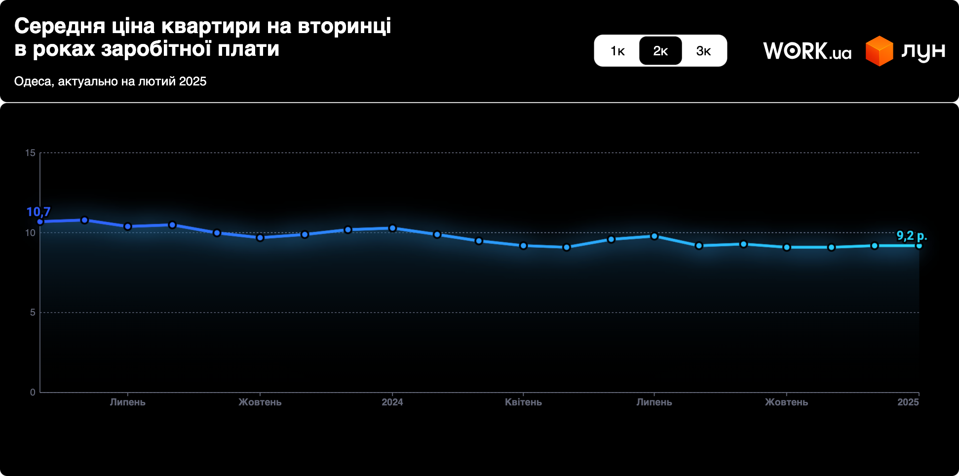 В Одесі в лютому 2025 року теж фіксується зниження співвідношення середньої зарплати до середньої вартості житла. Однокімнатна коштує суму заробітку за 6,1 років, 2-кімнатна - за 9,2 роки, а 3-кімнатна - за 12 років. В травні 2024 року середня вартість 1-кімнатної дорівнювала місцевому заробітку за 6,2 роки, 2-кімнатної - за 9,2 роки, а 3-кімнатної - за 12,3 роки.