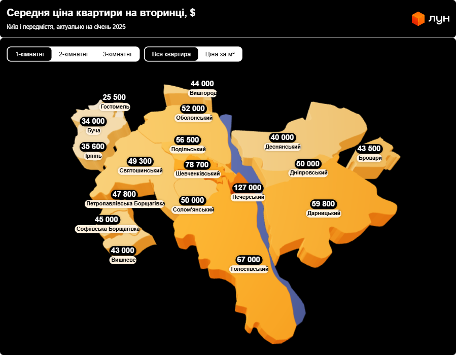 ЛУН оприлюднив дані по середній вартості квартир в районах столиці - згідно ним, найвища вартість квартир зберігається в Печерському районі столиці. В середньому, 1-кімнатна квартира тут коштує $124 тис. Найнижчі середні ціни традиційно зафіксовані в Деснянському районі, 1-кімнатна тут, в середньому, коштує $41,8 тис.
