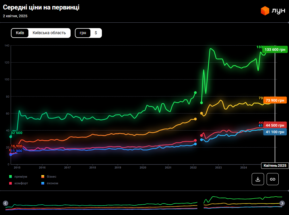 На історичному графіку ЛУН Статистика можна помітити: різниця між середньою вартістю квадратного метра в преміум та економ класах столичних новобудов збільшується до 4 разів в періоди економічних чи політичних потрясінь (наприклад, в період підвищення курсу долара в лютому 2015 року або на початку ковідних обмежень в березні 2020 року чи в період відновлення ринку після початку повномасштабного вторгнення рф, восени 2022 року). А коли ситуація в суспільстві стабілізується, різниця середньої ціни між новобудовами преміум та економ класів знижується і становить приблизно 3 рази.