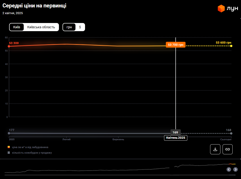 За даними ЛУН Статистика, станом на 1 січня 2025 року середня вартість квадратного метра новобудов в Києві становила 53,3 тис. грн, а на 1 квітня 2025 року - вже 53,7 тис. грн.