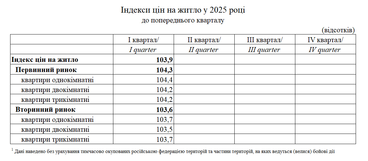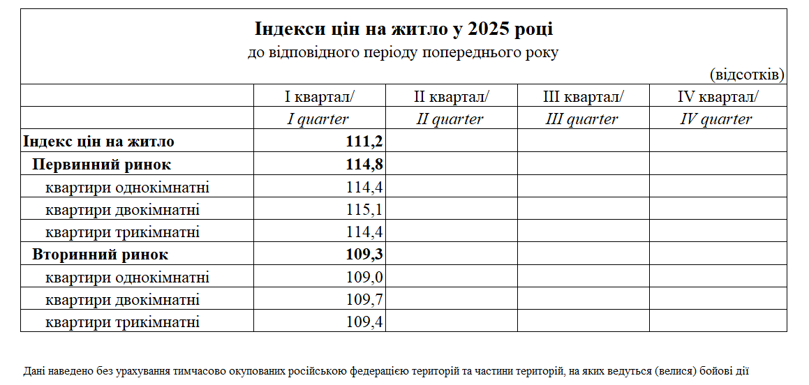 Згідно даних Держстату, протягом першого кварталу 2025 року загальний рівень подорожчання житла становив 3,9%. При цьому первинка за цей період здорожчала на 4,3%, а вторинка - на 3,6%.