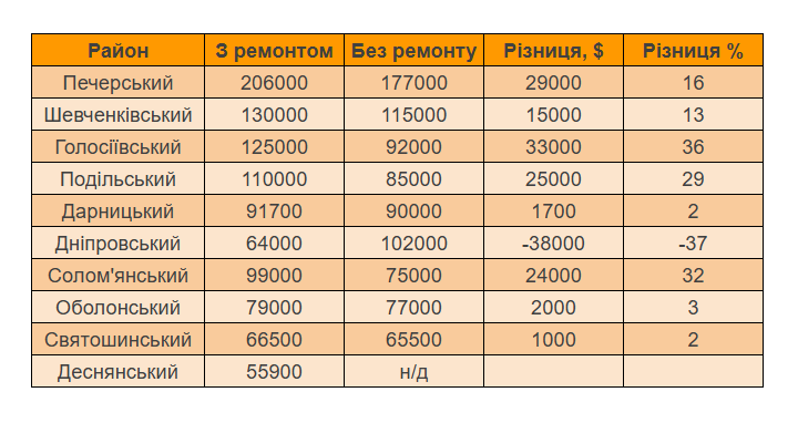 Зокрема, в сегменті 1-кімнатних квартир найбільша абсолютна різниця спостерігається в Печерському районі, де квартира з ремонтом коштує в середньому на $37 тис. дорожче, ніж аналогічна без ремонту. У відсотковому вираженні найбільший розрив зафіксований в Подільському районі, де різниця між середньою ціною квартир з ремонтом та без ремонту сягає 45% або $26,5 тис. А найнижчий - в Святошинському, де вона становить лише 8% або $4 тис.