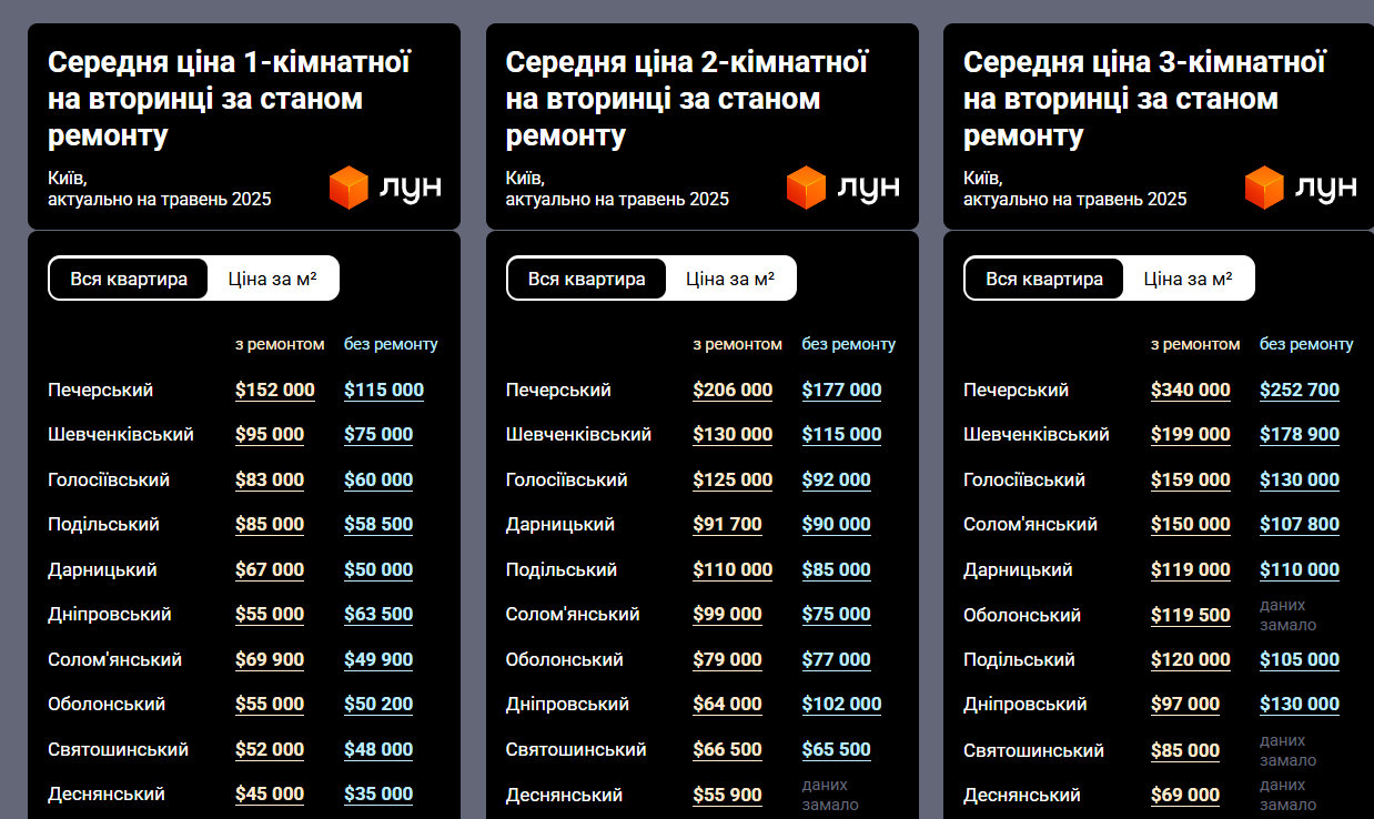 В ЛУН порахували актуальну середню вартість квартир з ремонтом та без ремонту в різних районах столиці.