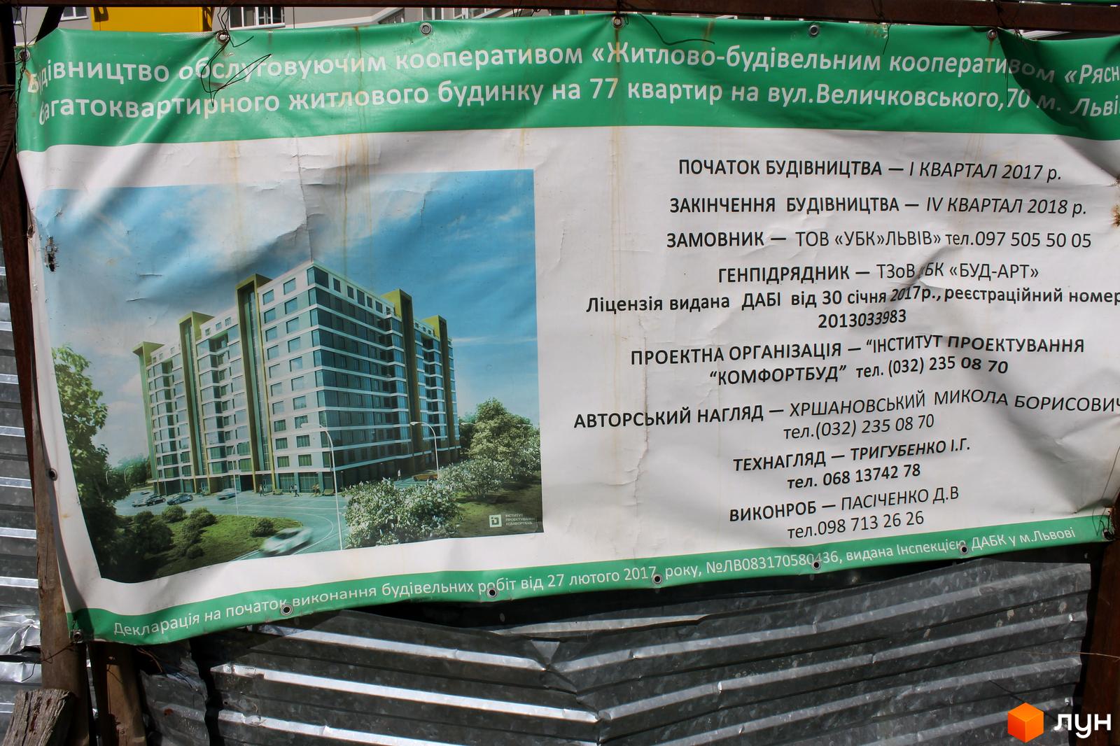 Затверджені Наказами № 134 та № 135 від 08.09.2015 р. на будівництво Обслуговуючим кооперативом “ЖИТЛОВО-БУДІВЕЛЬНИЙ КООПЕРАТИВ “РЯСНЕ“ багатоквартирного житлового будинку на 77 квартир (1 черга) ти 76 квартир (2 черга) з вбудованими приміщеннями громадського призначення на вул. І. Величковського, 70.