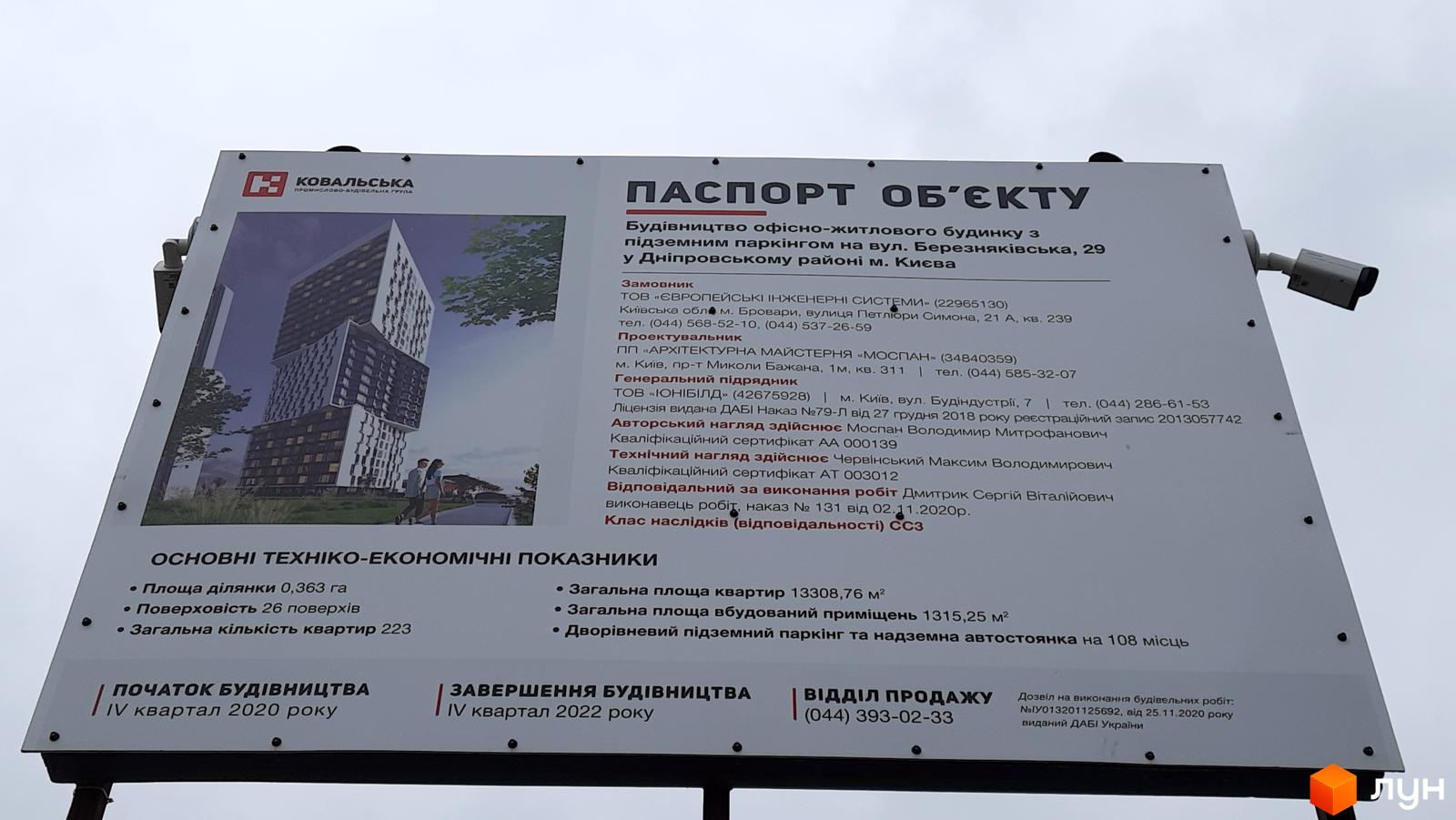 Будівництво офісно-житлового будинку з підземним паркінгом, на вул. Березняківська, 29 у Дніпровському районі м. Києва здійснюється відповідно до чинних Містобудівних умов та обмеження, а також на підставі чинного Дозволу на будівництво.