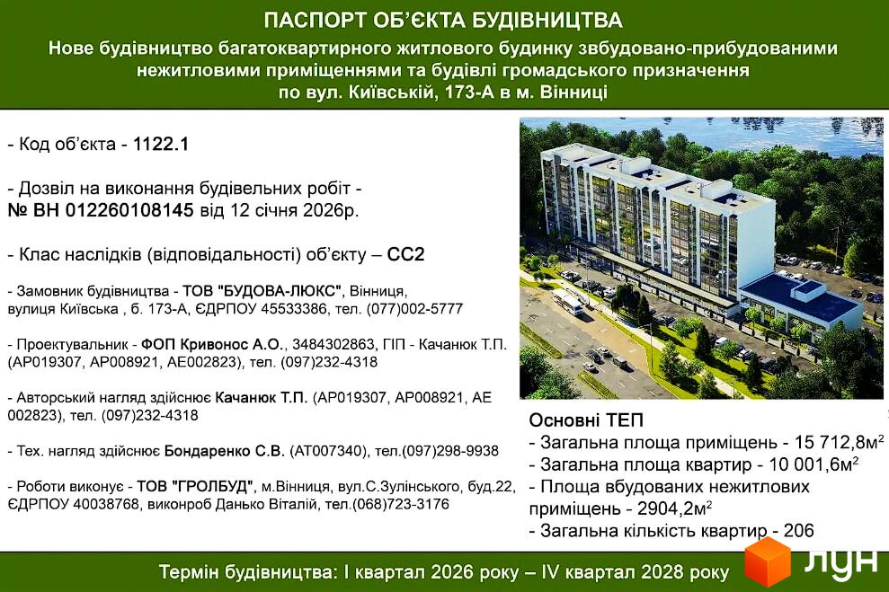 Дозвіл на виконання будівельних робіт ВН012260108145 від 12.01.2026 року (Нове будівництво багатоквартирного житлового будинку з вбудовано-прибудованими нежитловими приміщеннями та будівлі громадського призначення)